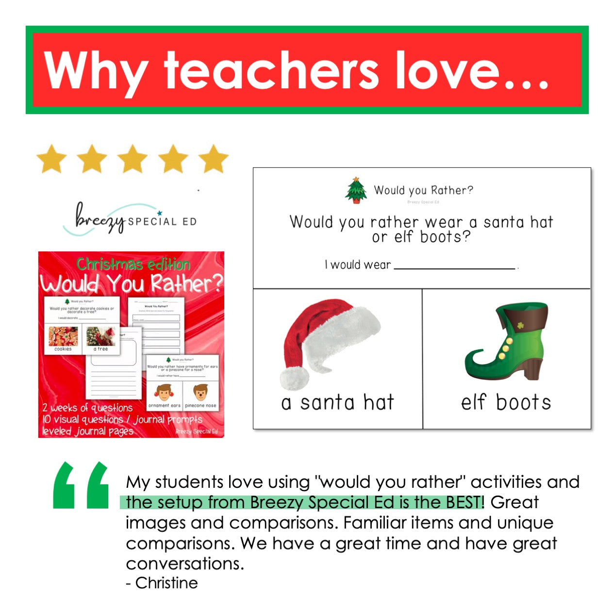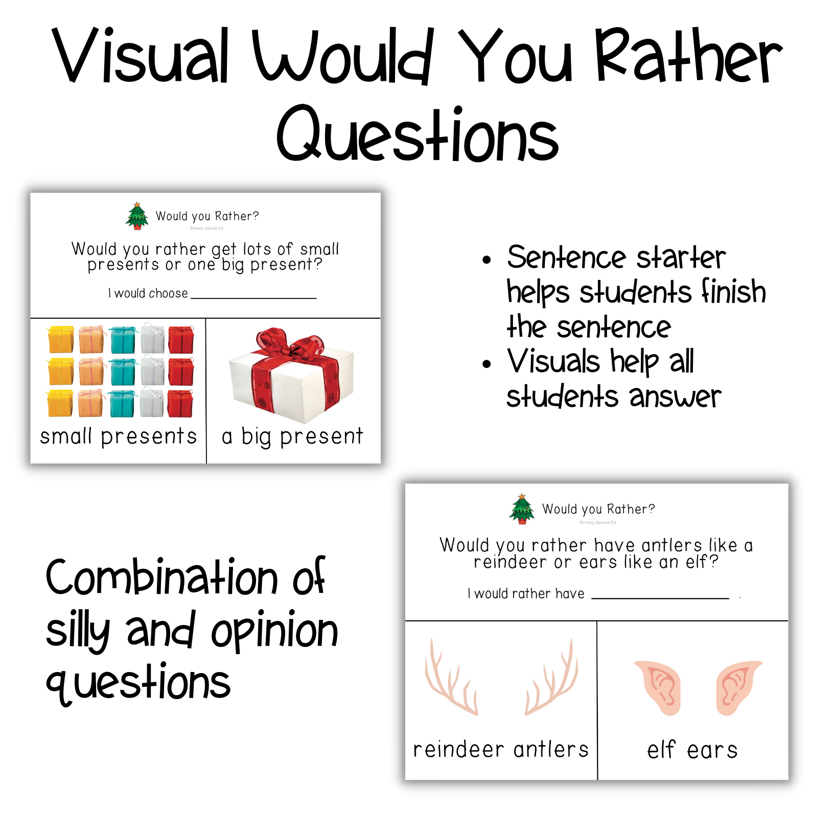 These Christmas would you rather questions are great for teaching special education students how to have a sense of humor, imagination, and fun! Also great for inclusion classes - the visuals make it accessible for everyone!