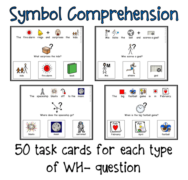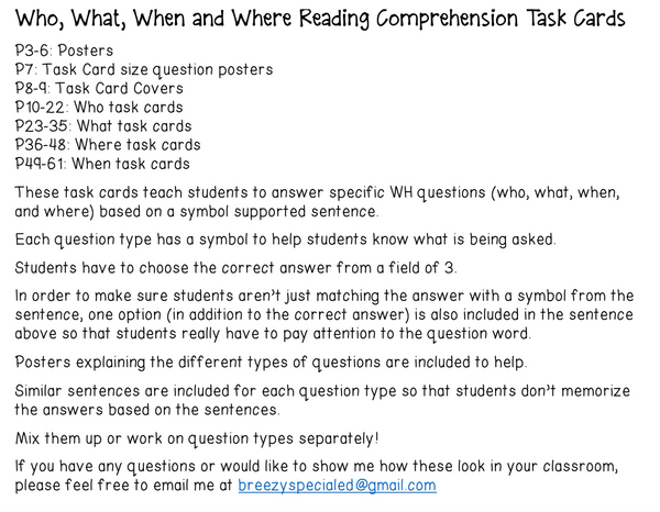 These 200 task cards work on comprehension and answering specific WH questions (who, what, when, and where) given a symbol supported sentence.