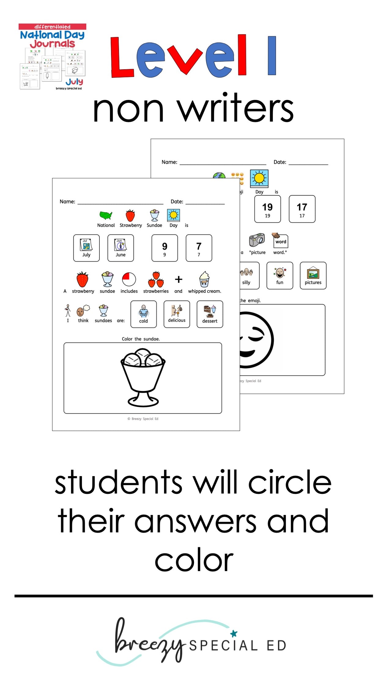 Level 1: Non writers. They can choose the correct symbol options for the month and date. The symbol sentence is next and you can have them circle the topic if you wish. Next they can give their opinion (errorless), as well as color the picture.